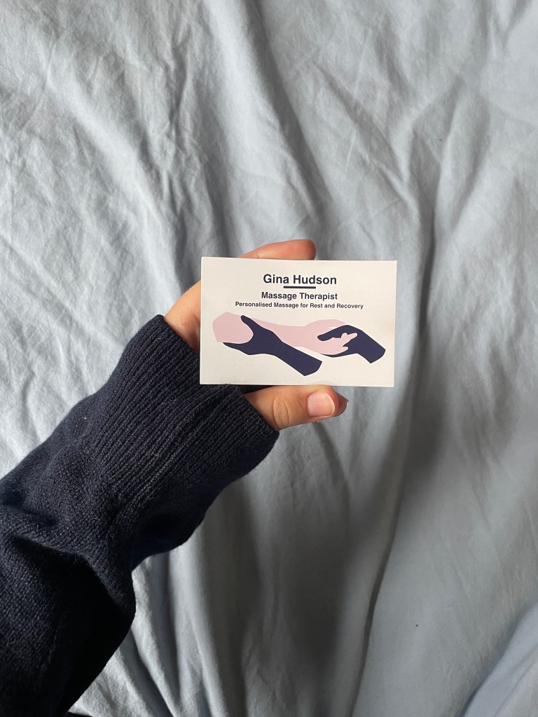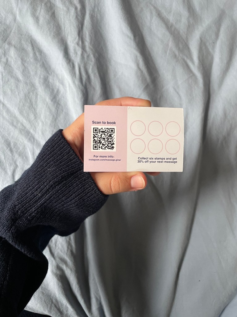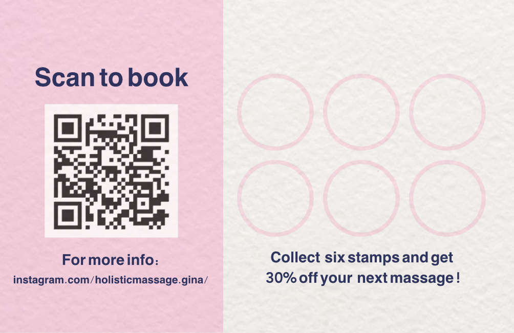 A business / loyalty card design for my client Gina who recently started practicing as a massage therapist. She was looking for a clean and playful look and that would communicate her individuality as a masseuse.